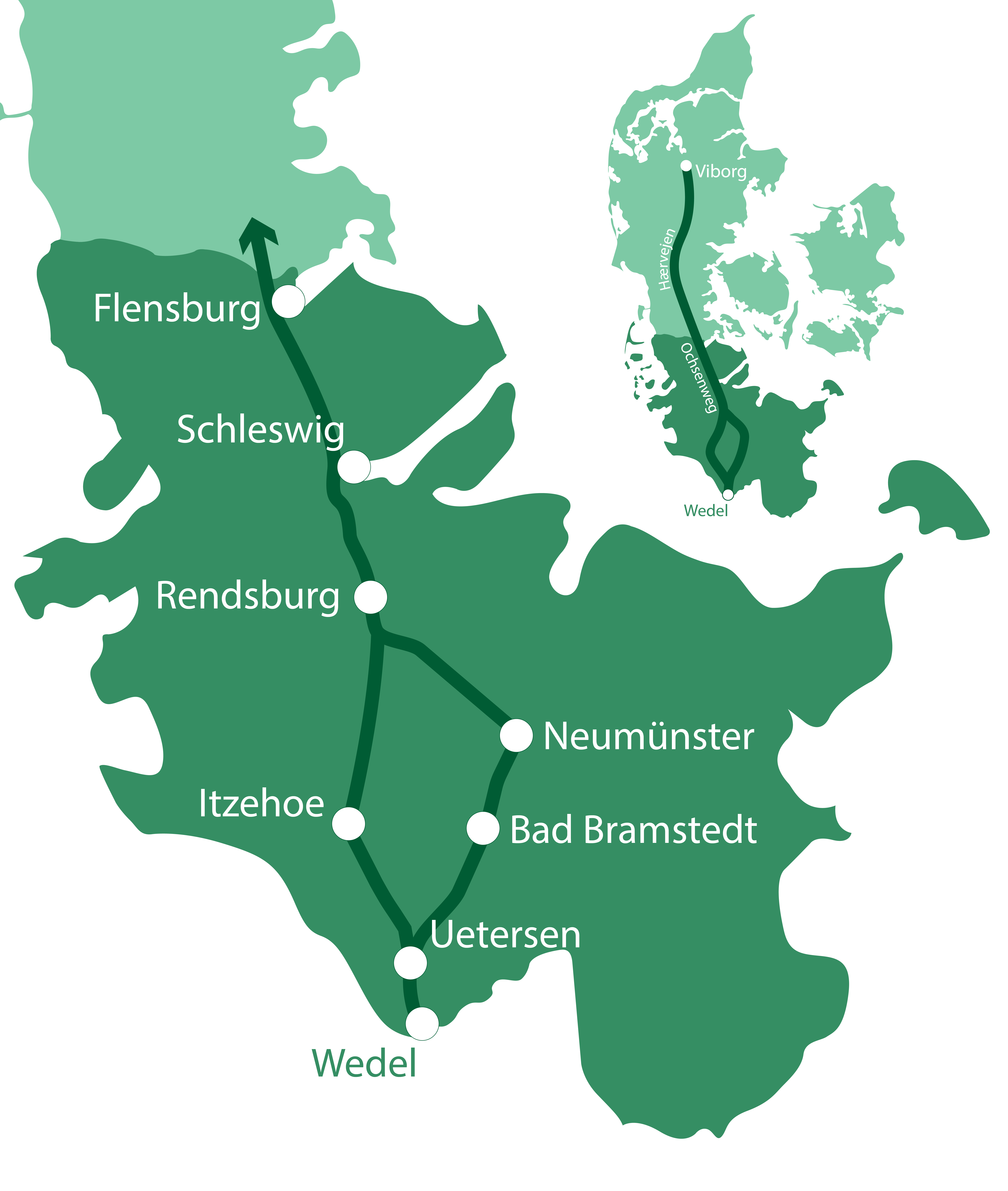Die Geschichte des „Ochsenweges“ begann vor mehr als 3500 Jahren. Schon in der Bronzezeit (1700 – 500 v. Chr.) wurden über die Landesmitte immense Mengen Rohstoffe (Kupfer und Zinn) auf einem etablierten Fernweg Richtung Norden transportiert. Die ersten schriftlichen Quellen des Mittelalters berichten von Kriegszügen, die ihn zum „Heerweg“ machten, aber auch von Pilgerfahrten aus Nordeuropa zu den heiligen Stätten der Christenheit. Seinen bis heute im kulturellen Gedächtnis des Landes gebliebenen Namen erhielt der Weg aber von den seit dem 13. bis ins 19. Jahrhundert aus Jütland stattfindenden Ochsentriften. Heute besitzt der „Ochsenweg“, der sich in Dänemark als „Hærvej“ fortsetzt, eine große touristische Bedeutung.