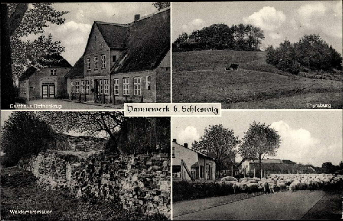 Alte Postkarte mit Dannewerker Ortsmotiven, li. oben Gasthof „Rothenkrug“, Aufnahme vor dem Brand 1962.