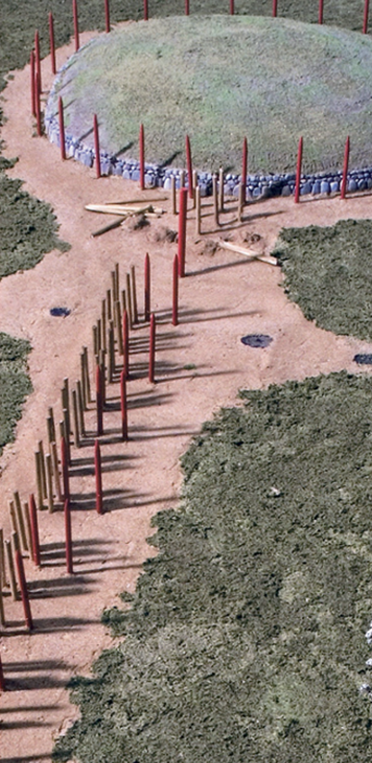 Modell der Grabanlage von Hüsby mit Grabhügel und Pfostensetzungen (Ausstellung Archäologisches Landesmuseum Schloß Gottorf).