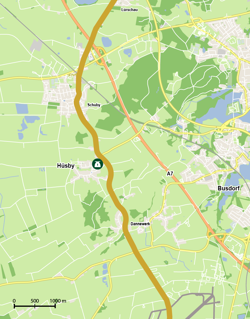 Die Archäologische Landesaufnahme verzeichnet westlich des Hüsbyer Ortskerns zahlreiche vorgeschichtliche Grabhügel, die sich in einem sanften Bogen über Schuby bis in die Feldmark westlich von Klein Dannewerk aufreihen. Sie stammen überwiegend aus der älteren Bronzezeit (1700 – 1100 v. Chr.) und waren schon vorhanden, als es das Danewerk noch nicht gab. Heute im Ackerland meist überpflügt und nur noch als flache Kuppen abgezeichnet, fanden hier in den letzten Jahrzehnten wiederholt archäologische Untersuchungen statt. Dabei stellte man fest, dass einer dieser Grabhügel augenscheinlich über einer älteren Steinkammer („Dolmen“) der Jungsteinzeit (4200 – 1700 v. Chr.) errichtet worden war. Sie wurde 1966 nördlich des Ortsrandes „Am Ochsenweg“ nach dem Originalbefund wieder aufgebaut.