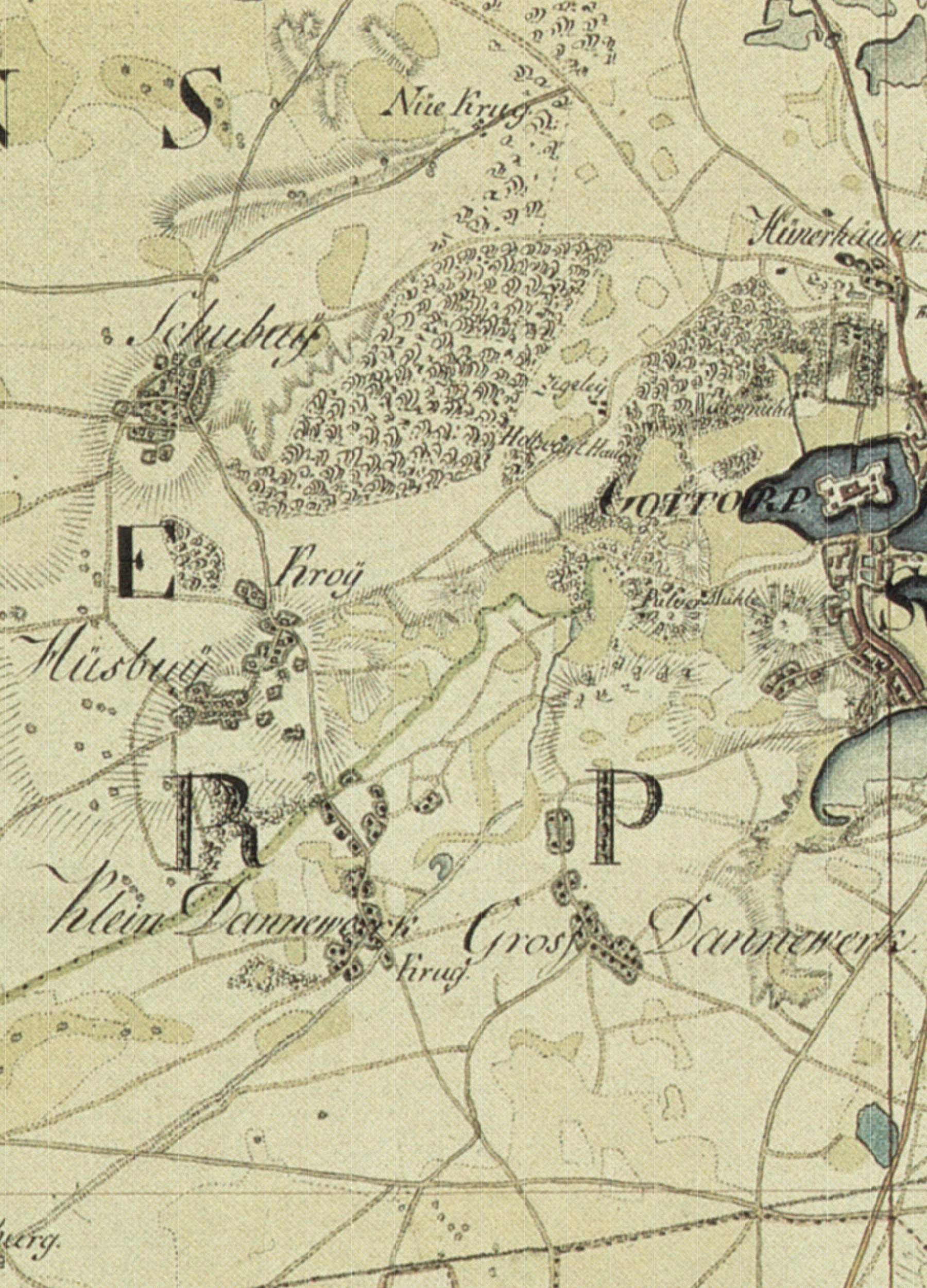 Annähernd gleicher Kartenausschnitt (s.o.): du Plat 1805, der Altweg („Am Ochsenweg“) vor dem Bau befestigter Straßen.