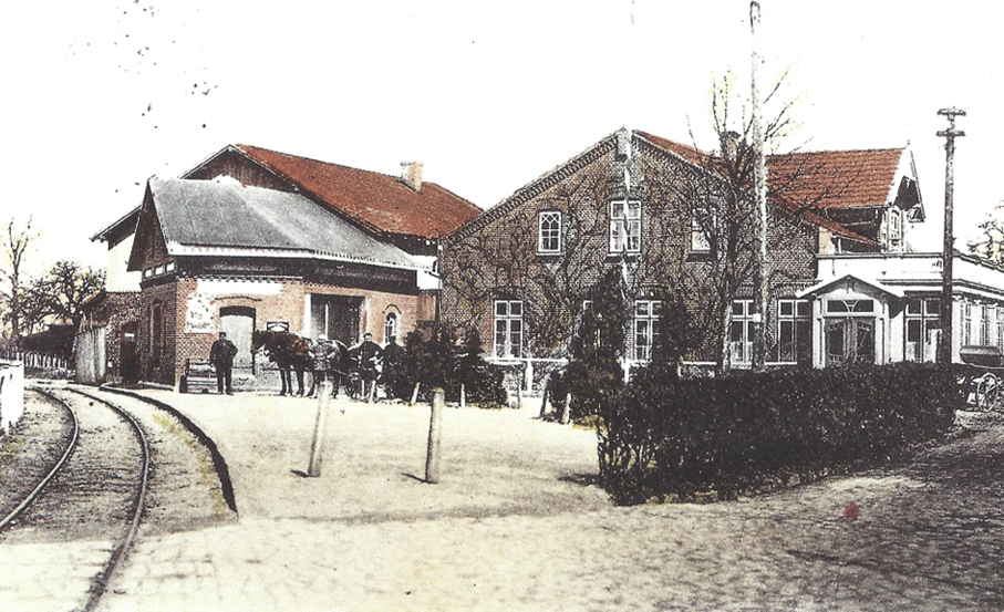 Jevenstedt historisch. Heutiges Dörpshus am Ochsenweg: 1907 als Bahnhof der Jevenstedt passierenden Rendsburger Kreisbahn (Rendsburg – Hohenwestedt), kolorierte Aufnahme).
